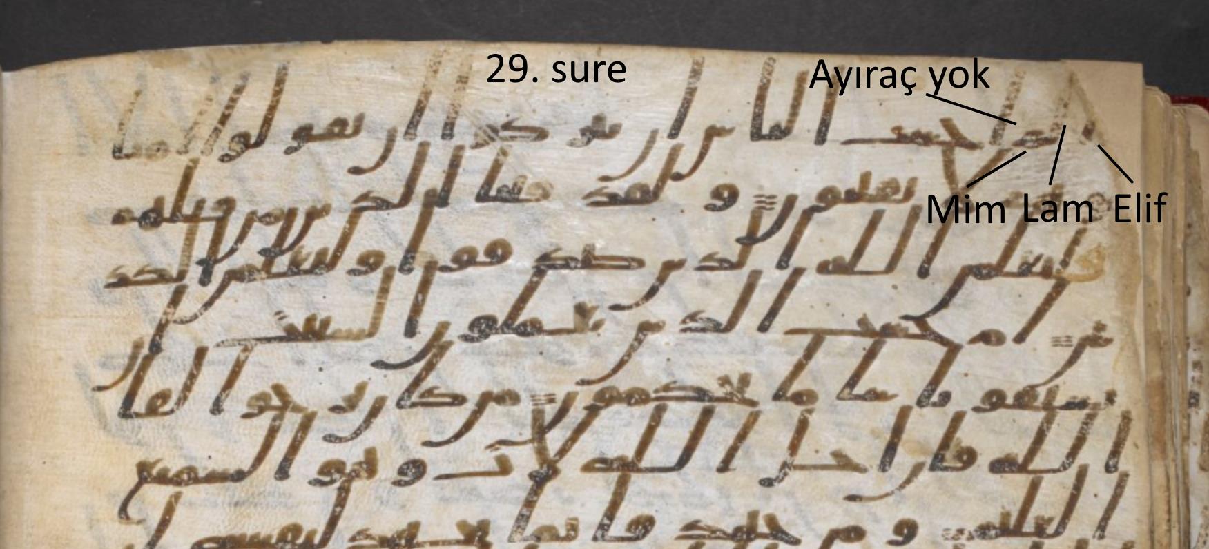 *42. surenin başlangıcı çok net okunmakta. Ha Mim bitişik olarak yazılmış. Ayn-Sin-Kaf bitişik yazılmış. Fakat birbirlerinden ayrı olarak yazılmışlar. Aralarında ayıraç yok. Tek bir ayet gibi yazılmışlar. Daha sonra ayıraç kullanılmış ve diğer ayete geçişmiş.