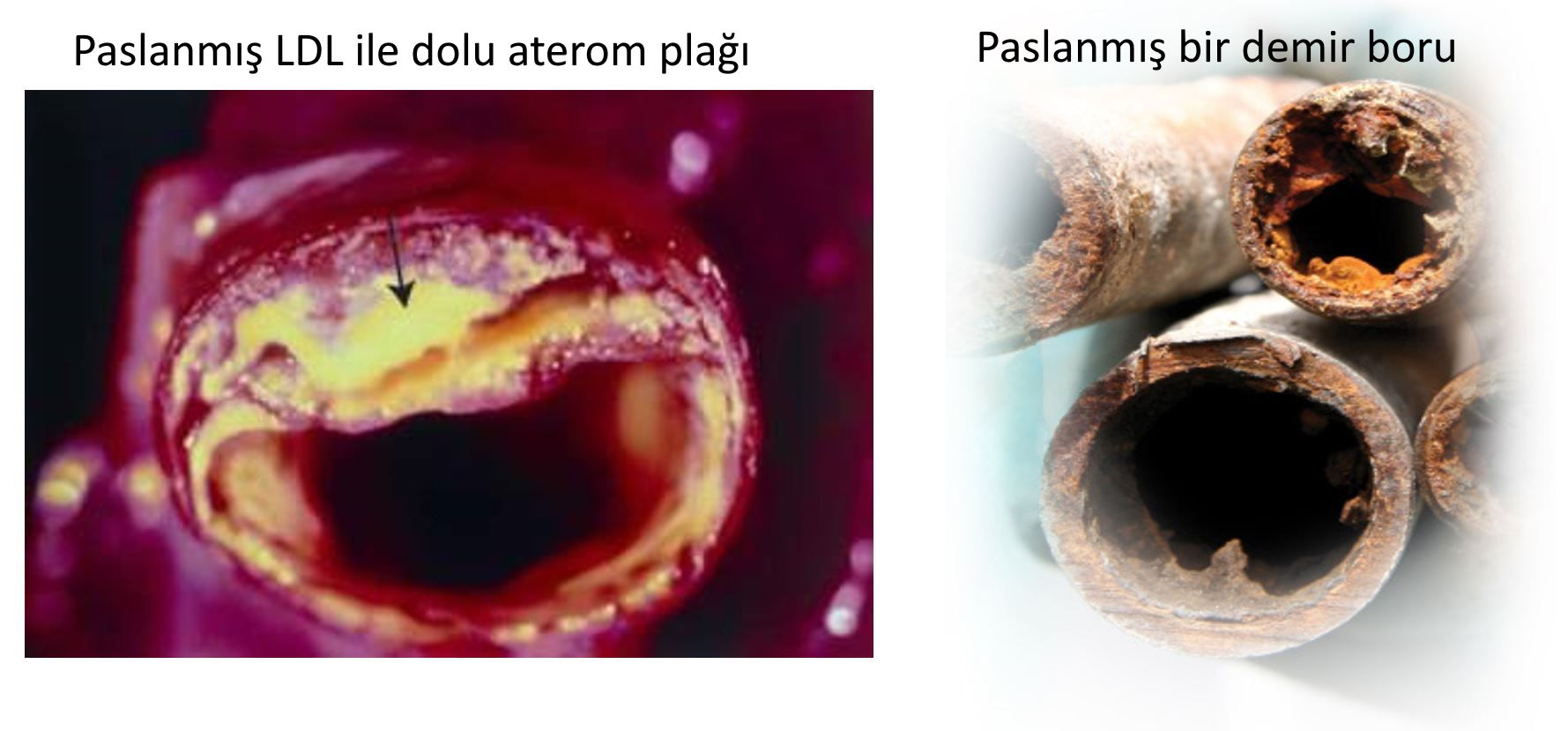Kalpte gerçek anlamda bir paslanma olur. Düşük yoğunluklu lipoprotein (LDL) (Low-density lipoproteins (LDL)) olarak bilinen yağlar (toplumda zararlı yağ olarak bilinir) paslanır. Bu paslanmayı bazı metal iyonları (Bakır), reaktif oksijen türleri (reactive oxygen species (ROS)) ve bazı enzimler (myeloperoksidaz-myeloperoxidase) gerçekleştirirler. LDH’ye oksijen atomu verirler. LDL oksijen atomu alarak oksitlenmiş LDL ‘oxidized LDL’ halini alır. Tıbkı demir ve diğer metallerin oksitlenip paslanması gibi LDL’de oksitlenir ve paslanır. Son yıllarda yapılan çalışmalarda myeloperoksidaz enziminin LDL’nin oksitlenmesinde çok önemli bir rol oynadığı gösterilmiştir.