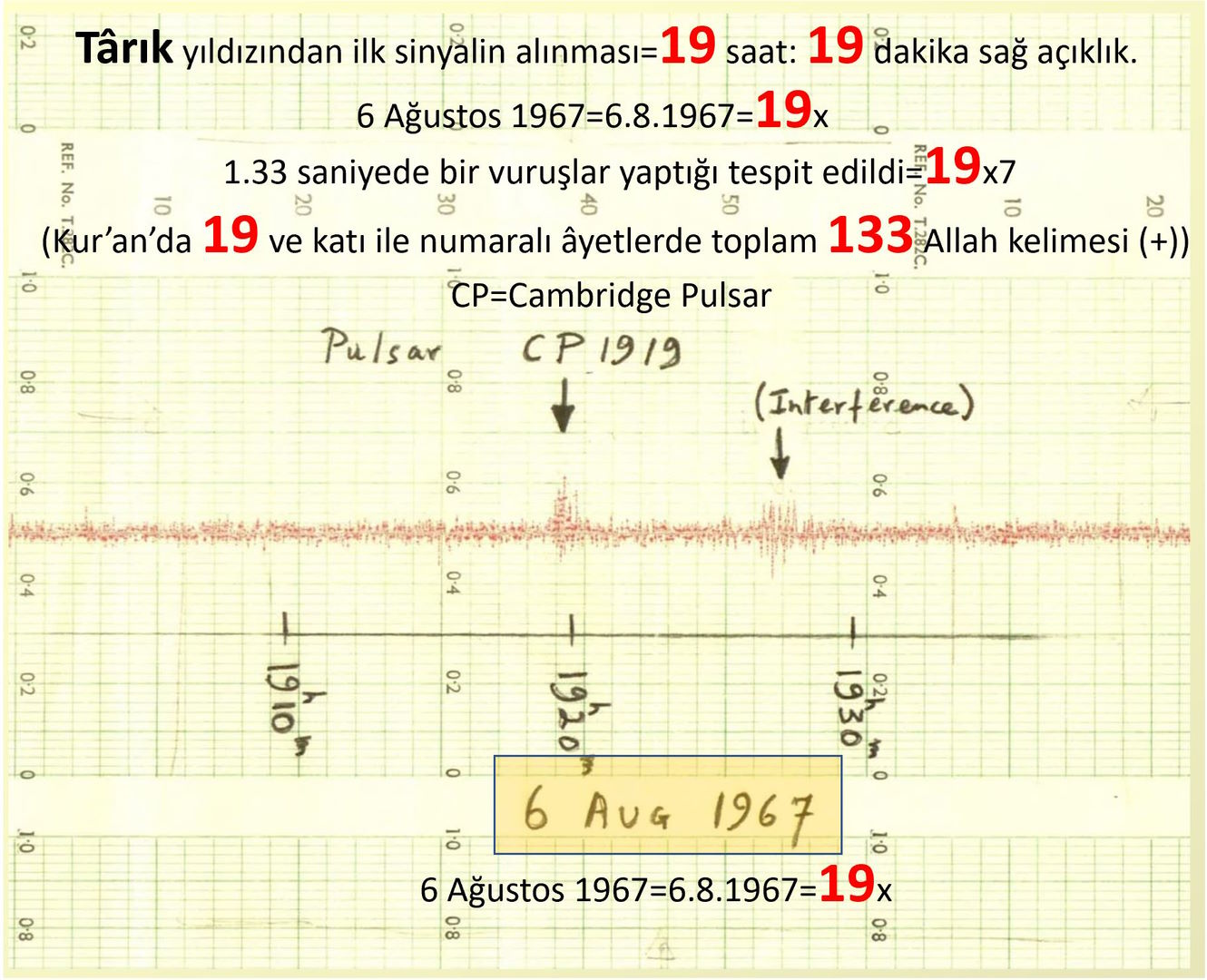 Târık yıldızından gelen ilk sinyalin keşfedilmesi ile 19 sayısı bağlantısını açıkça görüyoruz. Müddesir suresinde görevlendirilen 19 sayısı Kuran’ın Yüce Allah katından geldiğini kesin olarak ispatlar. Târık yıldızının ilk kez keşfedildiği ölçüm kağıdına Yüce Allah aşına bir bakın; 19 sayısı nasıl da pırlanta gibi parlıyor. Yüce Rabbimiz tarafından yerleştirilmiş. Çünkü her ikisi de büyük ayetlerdendir. Tarık yıldızı da ve 19 mucizesi de.