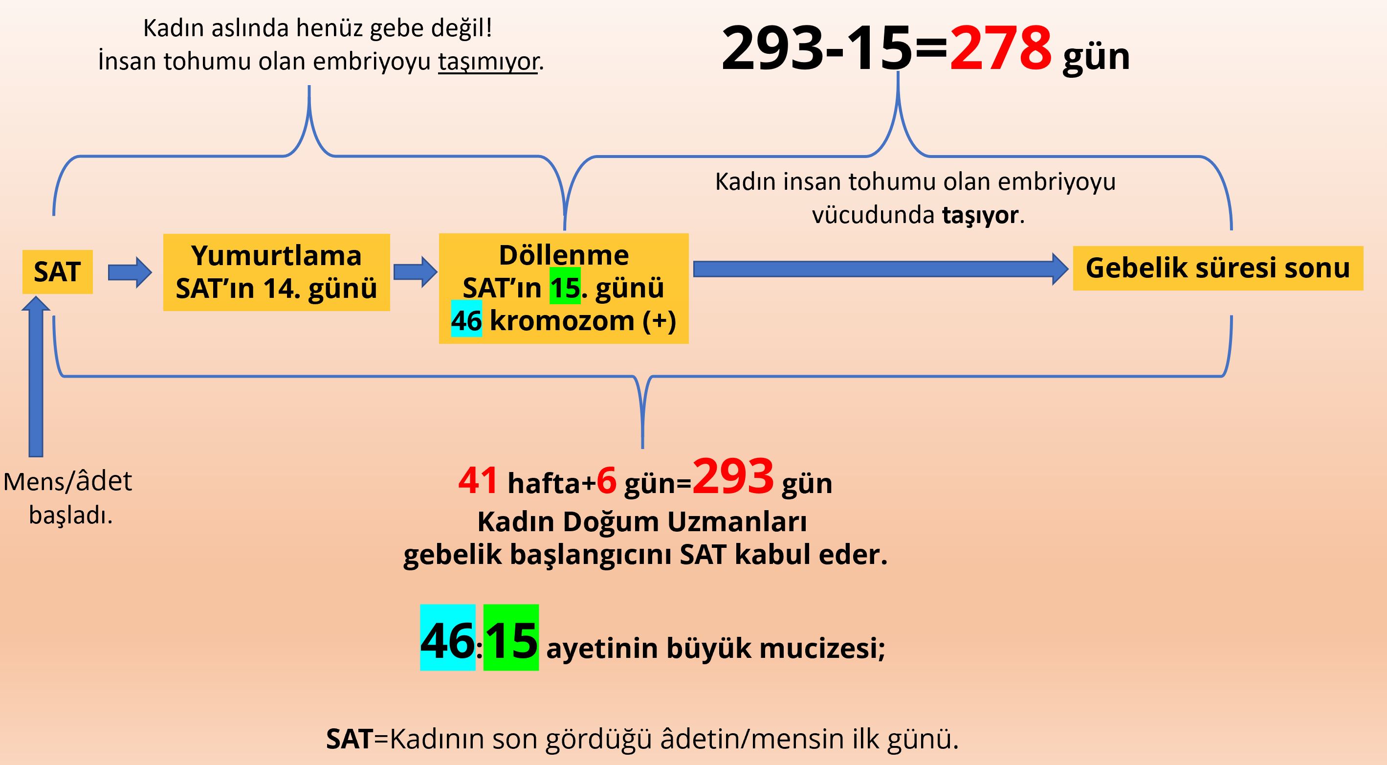 Ancak aslında SAT’a göre yapılan hesaplama bebeğin anne karnında taşınma süresini tam olarak yansıtmaz. Çünkü kadın son gördüğü âdet sonrası hemen gebe kalmaz. Son âdet tarihinden ortalama 14 gün sonra yumurtlama olur. Yumurta kadının tüpü içine atılır. Yumurta 12-24 saat yaşayabilir. Bu süre içinde döllenme olmaz ise yumurta ölür. Bir sperm bu yumurtanın içine girdiği anda döllenmiş olur ve yeni oluşan yapıya embriyo denir. O embriyo insanın tohumudur. Nasıl ki bir tohum bir meyvenin kendisidir. Embriyo da bir insanın genetik olarak kendisidir. Bu insan tohumu rahim içine düşer ve oraya yapışır. Daha sonra rahimde büyür ve doğuma kadar rahimde kalır. Daha sonra doğum gerçekleşir.